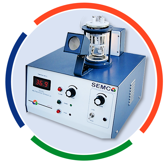 Melting Point Apparatus with 4 digits, 7 - Segment LED display is designed for accurate measurement of melting points and for checking the melting range of the solid samples. The apparatus consists of a silicon bath of about 200 ml capacity, covered with ptfe cover with 3 holes fitted, with a special type of oil immersion heater having three holes for holding the capillaries, one for boiling point tube and one for the thermometer. The apparatus consists of in-built magnetic stirrer, an electronic controller with indicator for precisely adjusting the rate of heating of silicon oil-bath, an ON/OFF switch, a pilot lamp, with magnifier, a glare free background illuminator, a High/Low range temperature selector switch and digital temperature indicator with PT100 RTD sensor.